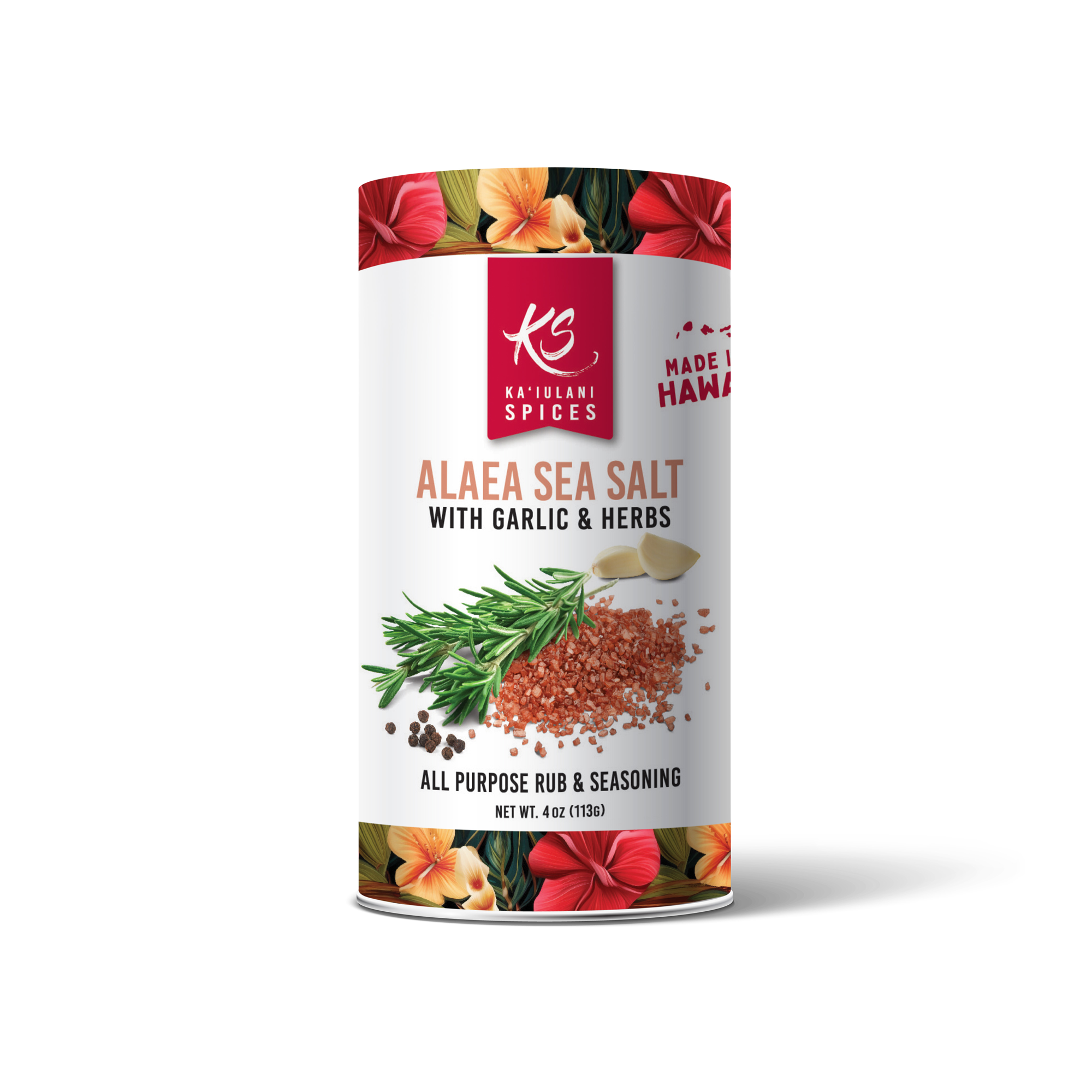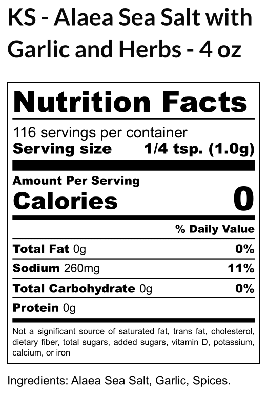 Alaea (Kauai volcanic red clay) Sea Salt, Garlic, Spices.