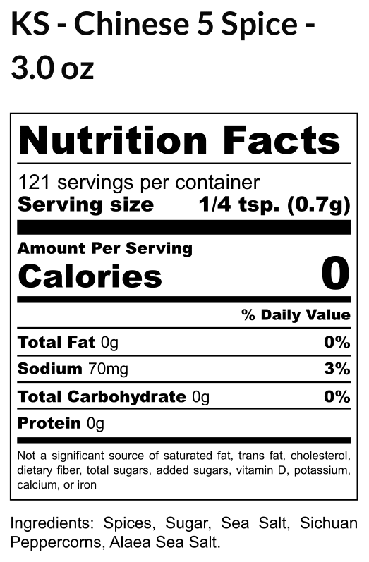 Spices, Sugar, Szechuan Peppercorns, Alaea Sea Salt.