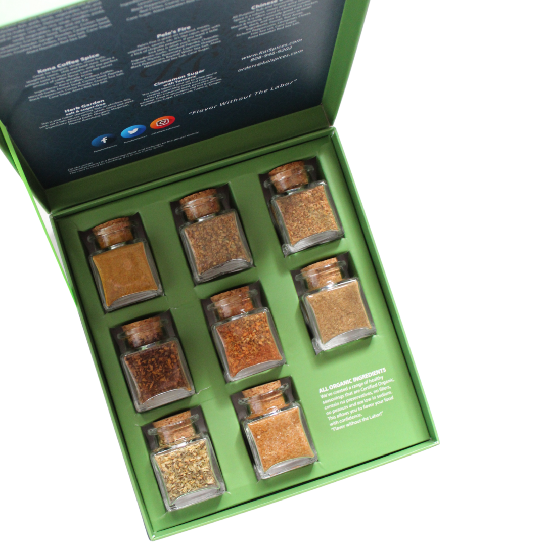 Gift the joy of carefully curated spices to any experienced cook or cook-in-the-making. They can attain expertly seasoned, delicious food with our limited-edition spice Ka‘iulani Spices Gift Boxes. Explore local Hawai‘i cuisines with the array of spices provided. This beautiful box includes an 8-jar collection of our favorite seasoning blends used international recipes. Taste the flavors of the world without leaving your kitchen. This incredible Gift Box (9” x 10”) includes: